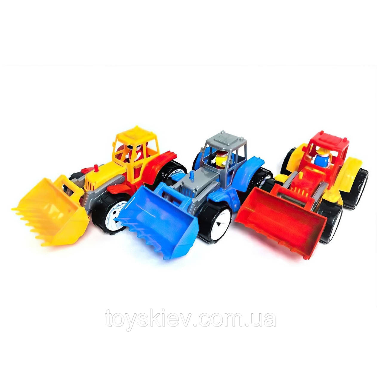 Іграшка виготовлена в яскравих кольорах із великими білосніжними колесами. Трактор має великий передній ківш, що схожий на фронтальний навантажувач. Кабіна трактора закрита, всередині сидить водій. Дизайн коліс масивний, з білими ободами та чорними шинами, що надає іграшці реалістичного вигляду.